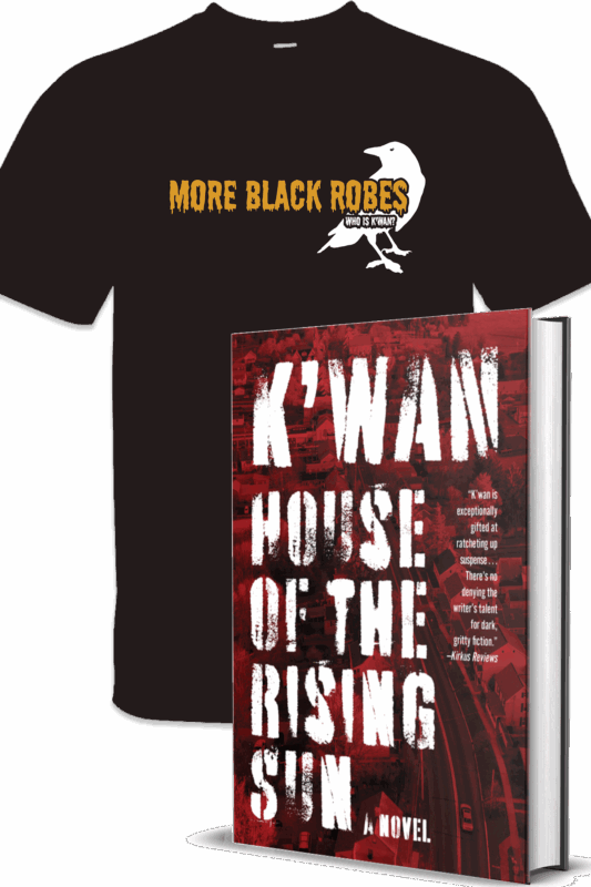 This exclusive preorder package includes an autographed hardcover copy of House of the Rising Sun, along with a limited-edition, custom “More Black Robes/Who Is K’wan?” Gildan 5000 T-shirt.